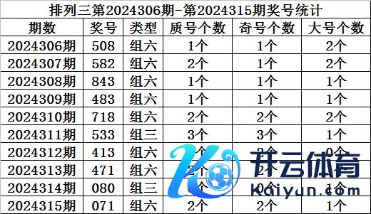 上期精采:胪列三第2024315期开奖:071体育集锦,质合比为2:1,奇偶比为1:2,大小比为2:1。