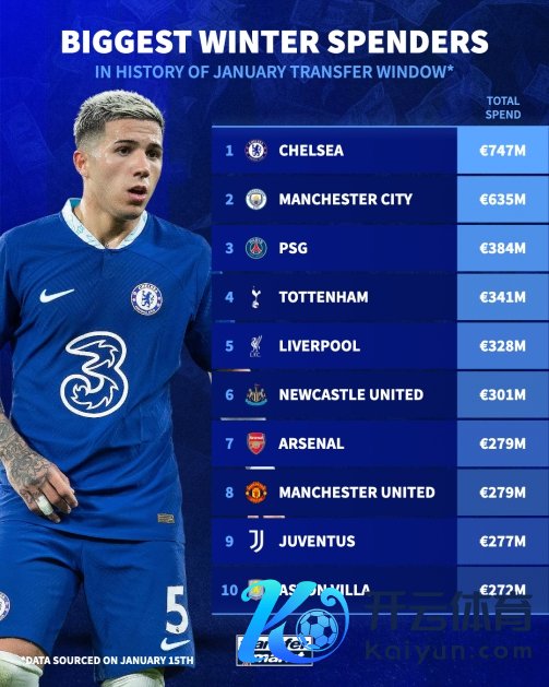 02月03日讯 当天北京时辰上昼6:00,25-26赛季五大联赛冬窗陆络续续落下了帷幕。德转统计了各支球队自从冬窗建造以来的总开销。 以下为冬窗总插足名次 1、切尔西7.47亿欧 2、曼城6.35亿欧 3、大巴黎3.84亿欧 4、热刺3.41亿欧 5、利物浦3.28亿欧 6、纽卡3.01亿欧 7、阿森纳2.79亿欧 8、曼联2.79亿欧 9、尤文2.77亿欧 10、维拉2.72亿欧 冬窗先容 国外足联在2002/03赛季前初次建造了一月转会窗体育录像/图片。