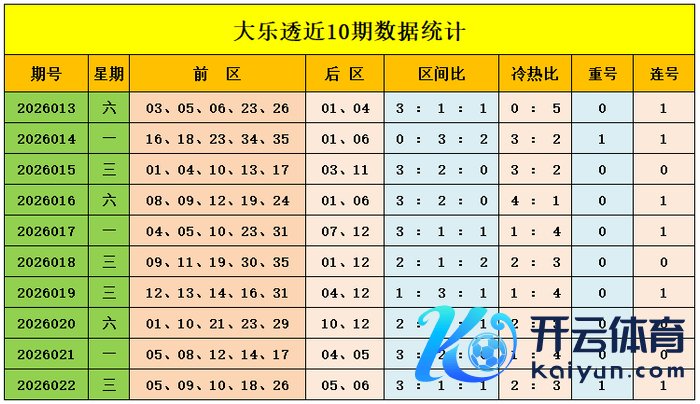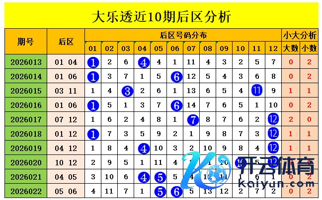 上期归来:大乐透第2026022期奖号为:前区05、09、10、18、26体育录像/图片,后区05、06,前区奖号三区比为3:1:1,冷热比为2:3,后区开出小小组合05、06 大乐透前区轮廓分析: 三区走势分析: 前一区(01-12):上期落3个号码:05、09、10,走势较热;一区近10期落23码,落码稍高于平均值,本期看好一区较上期走势降温,保举出号1个,见原:06 前二区(13-24):上期落1个号码:18,走势较冷;二区近10期落18码,落码稍高于平均值,本期看重二区走势较上期升温;