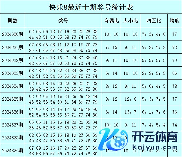 福彩自得8第2024329期开奖回来:07 09 15 16 17 20 22 25 37 39 48 58 59 67 69 70 72 74 79 80,其中奖号奇偶比开出11:9体育录像/图片,大小比开出10:10,四区比开出6:4:3:7,跨度开出73。
