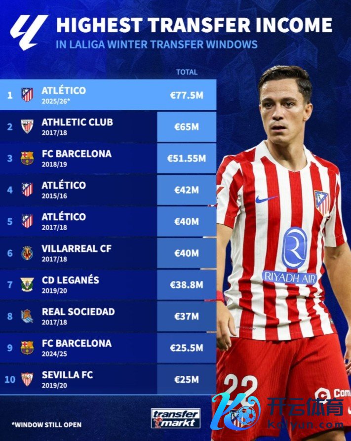 1月16日讯 跟着出售拉斯帕多里和加拉格尔,笔据德转数据,马竞以7750万欧成西甲历史上冬窗收入最高的球队。