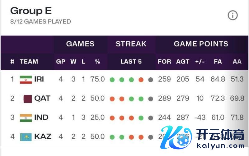 此役事后,卡塔尔男篮罢了了对伊朗的19年不堪。 E组也成为了独一还莫得球队提前出线的小组,伊朗、卡塔尔、印度和哈萨克斯坦分列1-4名。